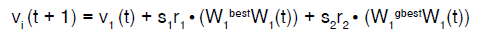 En donde: vi corresponde a la velocidad de la partícula; es el coeficiente cognitivo, mediante el cual la partícula i busca ubicarse en la posición donde ha obtenido resultados más exitosos; s2 es el componente social (comportamiento colectivo), por medio del cual la partícula i busca alinearse a la mejor posición hallada por el enjambre hasta el momento; por su parte, r1 y r2 corresponden a valores aleatorios que siguen una distribución uniforme; las variables W1 best y W1 gbest corresponden a la mejor posición obtenida por una partícula en concreto y a la mejor posición obtenida por cualquier partícula del enjambre, respectivamente. La siguiente ecuación (4) permite modelar la posición actualizada de la partícula i(FCM), una vez actualizadas las velocidades, según la anterior ecuación: