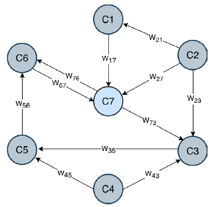 En la figura 2 (apéndice 4), se observa una estructura gráfica con siete nodos que representa un mapa cognitivo difuso simple. Los nodos son los conceptos (C) y la relación entre cada concepto (influencias) está representada por un peso (W), que se expresa por medio de una flecha dirigida desde un nodo de origen a un nodo de destino. El subíndice en la W de cada flecha indica la dirección de esa relación, es decir, W17 representa la relación entre el concepto 1 (C1) y el concepto 7 (C7). En el ámbito clínico, los nodos o conceptos suelen ser, por ejemplo, factores de riesgo asociados con una enfermedad, los síntomas de una enfermedad o las pruebas de laboratorio 1.