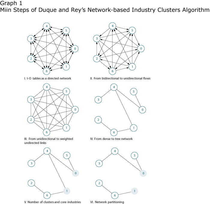 Graph 1 shows six graphs illustrating the main steps of Duque and Rey’s methodology. It starts by representing the transactions between industries as a dense directed network in which each node represents an industry and the links joining each pair of nodes represent a transaction between two sectors (see Graph 1, Figure I).