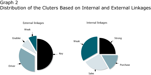 Graph 2 shows the distribution of the 12 clusters based on internal and external linkages. The classification based on internal linkages (right figure) reflects the importance of the cluster as an internal sales and/or purchase market for the industries assigned to the same cluster (industry members). Internal linkages can also be understood as a measure of interactivity between the industries within the cluster.