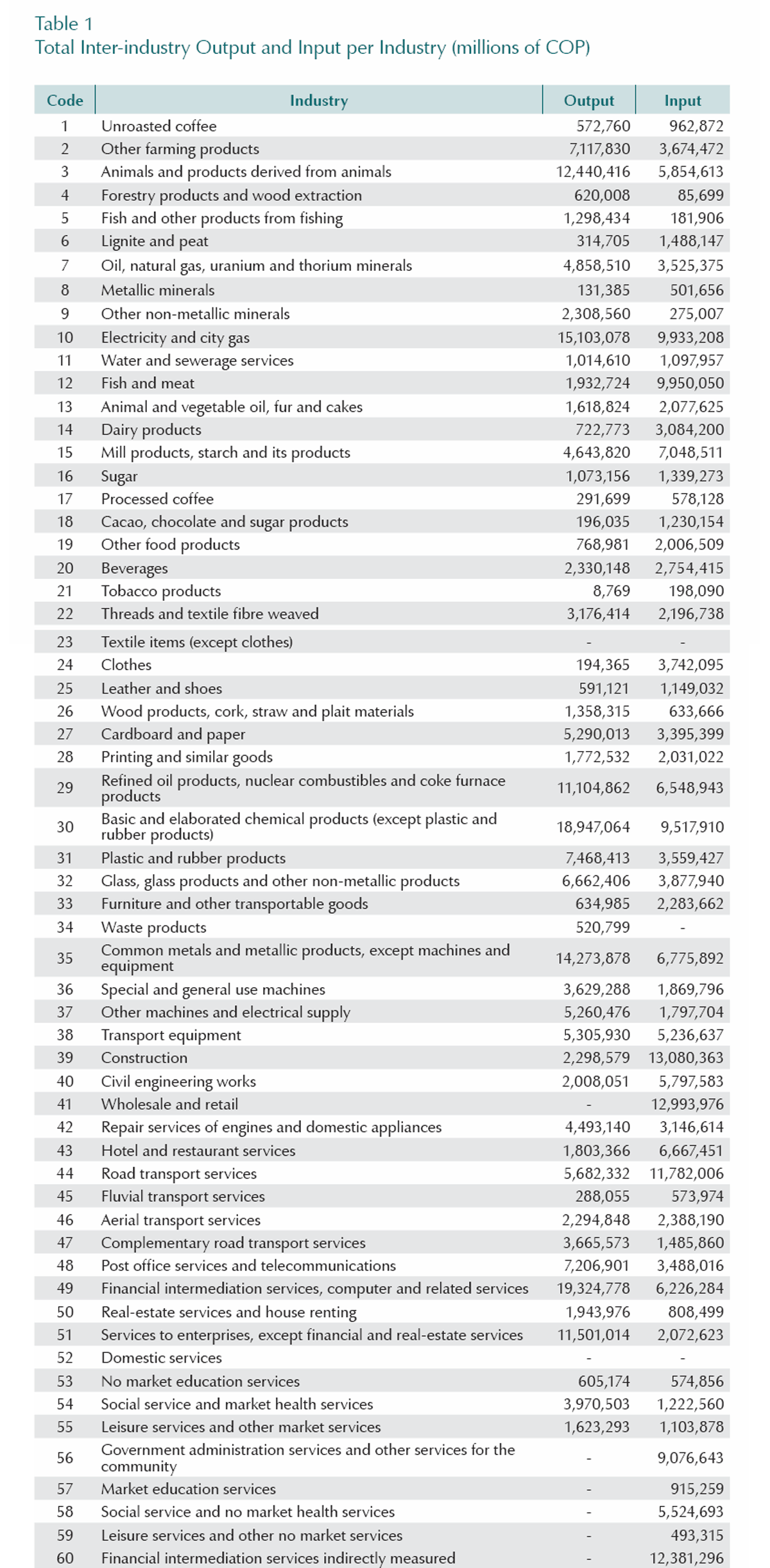 The product utilization matrix used in this application was obtained from the National Administrative Department of Statistic (DANE). Since 1951, this institution has been responsible for planning, collecting, processing, analysing, and disseminating the official statistics of Colombia. In this particular case, we used the projected 2005 product utilization matrix. This matrix contains the input-output transactions (in millions of COPs) between 60 industries9. Table 1 presents a brief description of 2005p I-O table for Colombia.