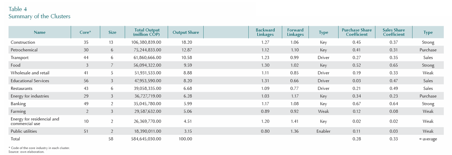 The NBIC algorithm identified 12 industry clusters in Colombia’s economy. According to the cluster’s internal linkages, 66.67% of the clusters were classified as either purchase oriented, sales oriented or strong clusters. In addition, based on the external linkages analysis, 91.67% of the clusters were classified as either key, enabler or driver clusters.