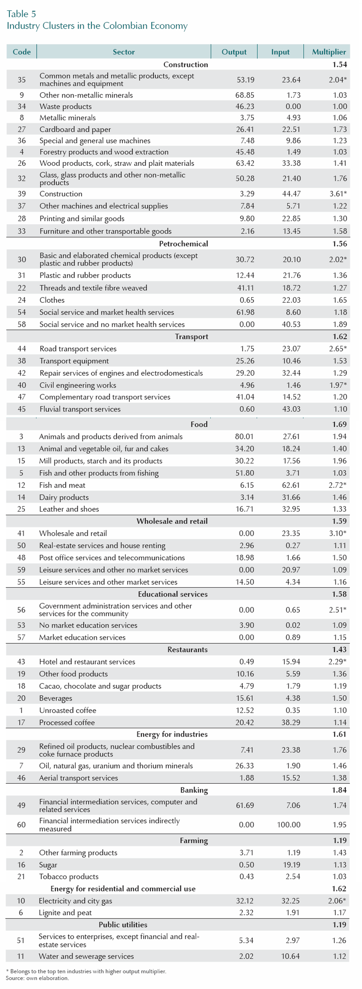 Among the outstanding clusters are: the clusters of Construction (the largest cluster in terms of industry members), Petrochemical and Transport represent together a 41.65% of 2005 Colombia’s total inter-industry output; the clusters of Banking and food are the largest clusters in terms of output multiplier, with 1.84 and 1.69 respectively.