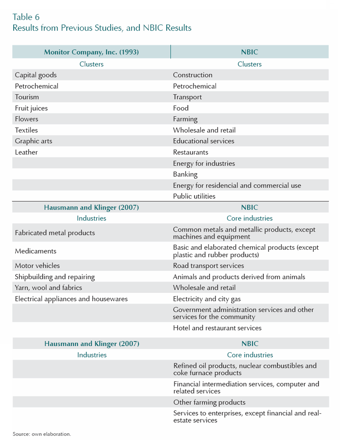 Table 6 shows the clusters and core industries obtained in this paper with the results found by (Monitor Company, Inc, 1993) and Hausmann and Klinger (2007). Since these three studies utilized different methodologies, input data, aggregation level and concepts of clusters, it is difficult to perform an objective comparison of the results.