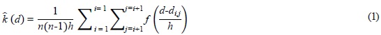 Donde con n establecimientos se calcula la distancia euclidiana entre cada par de establecimientos. Esto genera (n(n-1))/2 únicas distancias bilaterales a las cuales se les calcula la frecuencia para cada nivel de la distancia y la densidad correspondiente. Formalmente, la función K se calcula: