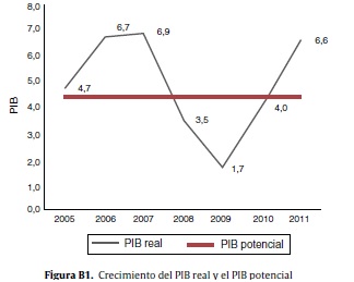 Así mismo, la inflación (3,17%) estuvo cercana a la meta fijada por el Banco Central, que fue para ese año el 3%, con un rango entre 2% y 4%. Si bien en rigor no puede afirmarse que la situación observada en 2010 corresponde al «estado estacionario», sí corresponde a una situación de operación que parece reflejar bien un funcionamiento típico de la misma. Por otra parte, se han presentado cambios importantes en los últimos años en el país, que han elevado en la segunda mitad de la década de los 2000 el crecimiento potencial de la economía, que ha pasado de niveles del orden del 2,5% en el período 2002-2004 al 4,4%. Ello refleja transformaciones importantes en las condiciones económicas, como lo ilustra el grupo de variables que se muestran en la tabla B1 de este anexo.