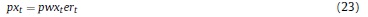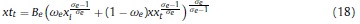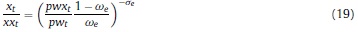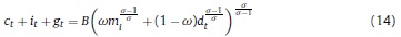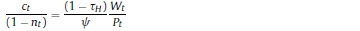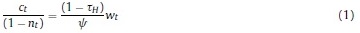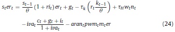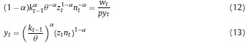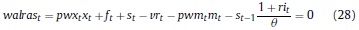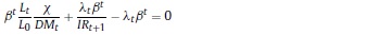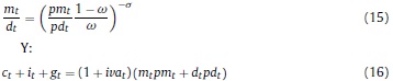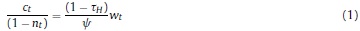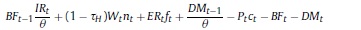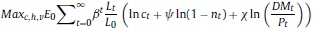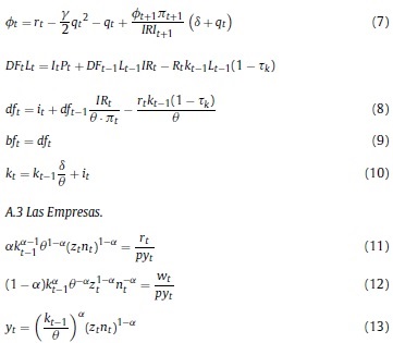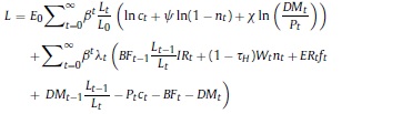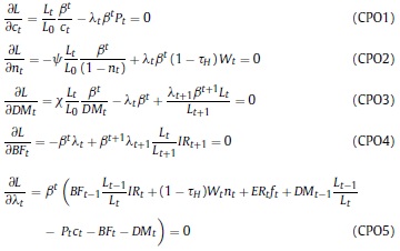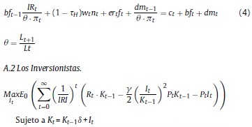 Donde: nt: oferta de trabajo per cápita del período t; ct: consumo per cápita del período t; Pt: precio de los bienes consumidos; Lt: población en el período t; β, ψ, χ: la tasa de descuento subjetiva y los parámetros de preferencia por el ocio y los saldos reales en la función de utilidad; BFt: stock nominal de activos financieros per cápita; IRi: tasa bruta de rendimiento nominal en el mercado financiero; Wt: salario nominal; τH: tasa impositiva aplicable a los hogares8; ERt: tasa de cambio nominal; ƒt: remesas exógenas per cápita del exterior; DMt: saldo nominal de dinero per cápita.