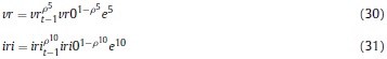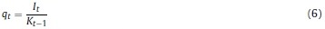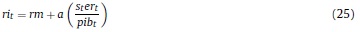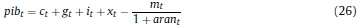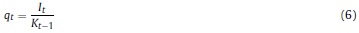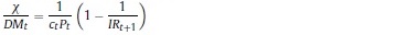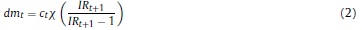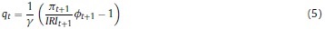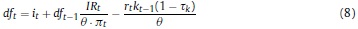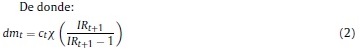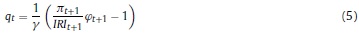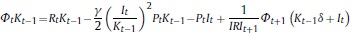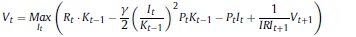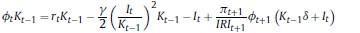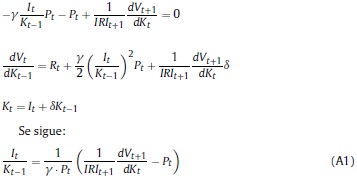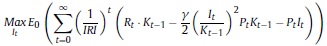 Donde Rt, γ, Pt, δ son respectivamente, la renta al capital, la constante del costo de ajuste, el precio de los bienes de capital y la tasa bruta de depreciación, Kt es el capital, It la inversión privada, e IRI es la tasa bruta de interés, que depende de la tasa de intervención del banco central.