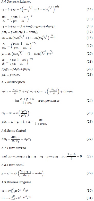 Así pues, el modelo cuenta con 4 grupos de agentes optimizadores, y tres3 agentes neutrales, que gestionan flujos de fondos. Los agentes optimizadores son los hogares, las empresas, los comercializadores y los inversionistas1. Los primeros deciden acerca de consumo, ahorro y oferta de trabajo; los segundos, acerca del empleo de factores y el destino de la producción (maximizando la renta que obtienen de exportaciones y ventas domésticas, dado el empleo de factores productivos); los terceros, acerca de la mezcla óptima de importaciones y bienes domésticos, con la que atenderán la demanda de consumidores y gobierno; y los últimos, determinando el stock óptimo de capital, que ofrecen a las empresas. Los agentes neutrales que gestionan fondos son el sector financiero, que intermedia recursos entre hogares e inversionistas; el gobierno, que recauda impuestos y gestiona gasto público2 y el banco central que maneja un portafolio de reservas y ofrece dinero en la economía, y define la tasa de interés que los inversionistas involucran en sus decisiones de inversión