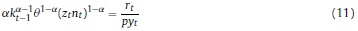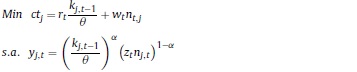 Donde ct es el costo total de cada empresa; r, w los precios de los factores; y el producto; z la productividad; y a el parámetro de participación de la función Cobb-Douglas.