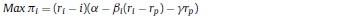 El problema de optimización para el banco de tipo i consiste en maximizar sus beneficios que surgen por su actividad crediticia escogiendo un nivel de tasas de interés (ri) teniendo en cuenta el nivel promedio de las tasas activas del sistema (rp) y su costo de oportunidad de colocar los recursos en el mercado monetario (i). Adicionalmente, el banco debe tener en cuenta la restricción a su nivel de apalancamiento que surge de la regulación de capital. El problema de maximización para el banco de tipo i es el siguiente: