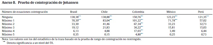 Como la mayoría de las series muestran ser integradas de orden 1, se llevó a cabo la prueba de cointegración de Johansen. Los resultados de la prueba (anexo B) indican la presencia de relaciones de cointegración en las series evaluadas en todos los países.