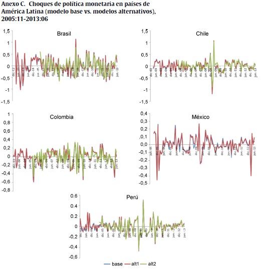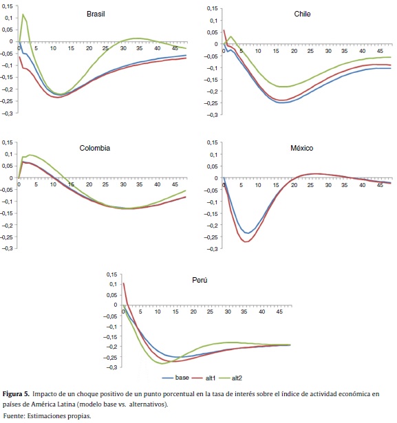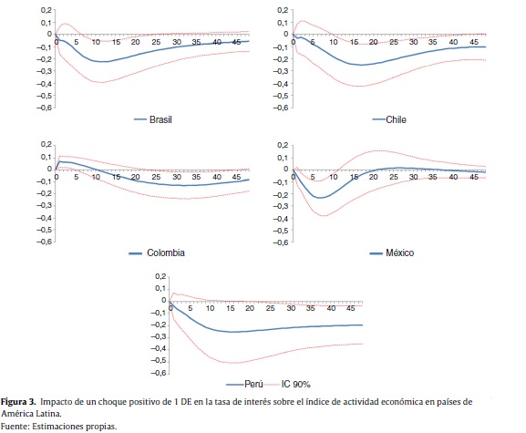 Los resultados obtenidos estimando un VAR estructural con las mismas variables muestran que en los 5 países analizados la actividad económica disminuye ante un aumento inesperado en la tasa de interés de política monetaria de los bancos centrales. Sin embargo, la magnitud del impacto no es igual en todos los países, ni tampoco el momento del tiempo en que el impacto acumulado alcanza su punto máximo. La mayor respuesta de la producción ante un choque positivo de política monetaria se presenta en México y Perú, donde alcanza a registrar una disminución acumulada máxima alrededor del 2%. En Chile la respuesta máxima acumulada es del 1,2%, mientras que en Colombia y Brasil, alcanza un máximo del 0,7 y del 0,6%, respectivamente. También se encontraron diferencias importantes en el momento del tiempo en el que se alcanza esta máxima respuesta, ya que mientras en México es 7 meses después de registrados los choques, en Colombia se obtiene casi 2 años y medio después.