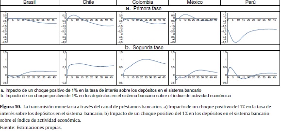 En la figura 10 se muestran las funciones impulso respuesta que reflejan la transmisión de la política monetaria a través del canal de préstamos bancarios. Los resultados obtenidos permiten concluir que la poca relevancia de este canal en Brasil, Chile, Colombia y México, que se mostraban en la sección 3.2, se debe principalmente a la poca incidencia que la tasa de interés de política monetaria tiene sobre los depósitos en el sistema bancario, es decir, que la transmisión falla en la primera fase del canal. Por su parte, en Perú, que es el país donde el canal mostraba ser más importante, la primera fase del canal funciona de manera muy clara.