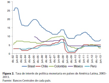 En todos los países el comportamiento de estos choques está muy relacionado con la postura de la autoridad monetaria durante el período de estudio, que se ha caracterizado por varios ciclos de subida y bajada de tasas de interés, que en general estuvieron rondado niveles cercanos al 5% la mayor parte del tiempo en Chile, Colombia, México y Perú, como se puede apreciar en la figura 2. En Brasil, por los niveles en los que se encontraba la tasa de interés en 2003 —que estaba alrededor del 25%—, la autoridad monetaria fue mucho más activa durante el período de análisis al momento de decidir cambios en las tasas de interés de política monetaria, especialmente a la baja, que llevaron la tasa de interés a valores alrededor del 7% en 2013, pero también ha habido algunos pequeños tramos de subida de tasas de interés, lo que en últimas se ve reflejado en una mayor volatilidad de los choques, como lo muestra la desviación estándar de dichos choques estimada para cada uno de los países. Esta volatilidad es menor en México y en Perú, explicada especialmente por lo estable que se mantuvo la política monetaria en estos países durante buena parte de la década de análisis, principalmente en los últimos meses de dicho período, después de los fuertes ajustes de tasa de interés a la baja que se dieron, como en todos los países, para enfrentar la crisis financiera mundial de 2008.