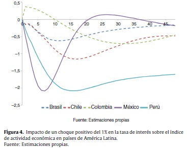 Sin embargo, si se considera el impacto de un choque positivo de tasa de interés de igual magnitud en términos absolutos en todos los países, se encuentran diferencias importantes. En la figura 4 se puede apreciar que ante un aumento inesperado del 1% en la tasa de interés de política monetaria de los bancos centrales, la respuesta es mayor en México yen Perú, donde la actividad económica registra una caída máxima acumulada cercana al 2%. En Chile, la disminución de la actividad productiva es del 1,2%, mientras que en Colombia es del 0,7%, y en Brasil, del 0,6%.