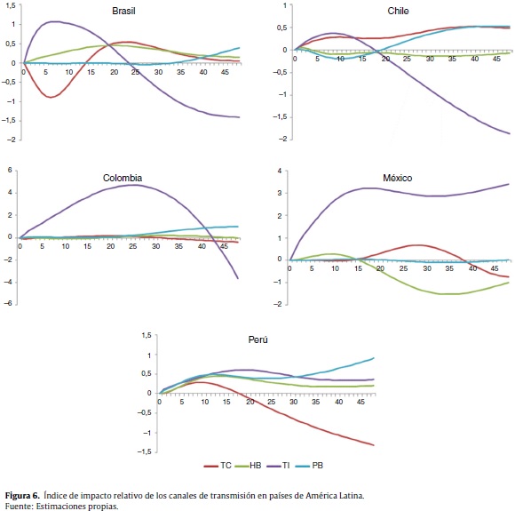 Cabe anotar que si se realizan cambios en este modelo SVAR ampliado en el ordenamiento de las 4 variables relacionadas con los canales de transmisión, los resultados para los 5 países (no reportados para ahorrar espacio) no presentan mayores cambios.