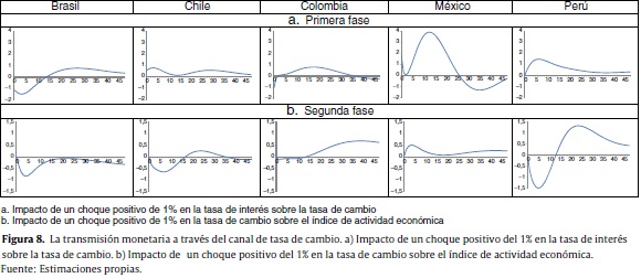 Los resultados de la figura 8a muestran el comportamiento de la primera fase del canal de tasa de cambio. Allí se puede observar que un choque positivo de política monetaria genera una disminución en la tasa de cambio solo en Brasil y México, y por unos pocos meses. En Chile, Colombia y Perú se genera, contrariamente a lo esperado, un aumento significativo en la tasa de cambio durante el año y medio siguiente a la ocurrencia de los choques. Una explicación para este resultado podría ser que ante un endurecimiento de la política monetaria, a los inversionistas les importa más la posibilidad de que la actividad económica se frene que la posibilidad de obtener mayor rentabilidad en sus inversiones producto del aumento en las tasas de interés, generándose una salida de capitales que, a su vez, lleva a un aumento en la tasa de cambio, que es el resultado observado en los gráficos de todos los países.