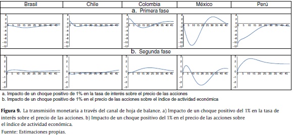 En la figura 9 se presentan las funciones de impulso respuesta que muestran el efecto de un choque de política monetaria sobre el precio de las acciones y cómo un movimiento en esta variable afecta el indicador de producción. Los resultados obtenidos muestran que solo en Perú las 2 fases de este canal se comportan según lo esperado en teoría, y es por esta razón que solo en este país el canal mostraba ser relevante según los resultados presentados en la sección3.2. En Brasil la primera fase es débil, y esa es la razón por la que el canal funciona pero no de manera muy fuerte. Por su parte, en México el canal parece operar de manera importante y como se espera en teoría, pero solo en los primeros meses después de ocurridos los choques. Extrañamente después del décimo mes un aumento en el valor de las empresas se traduce en una disminución en la actividad productiva. Y en Colombia y Chile el canal no funciona porque la transmisión falla en la primera fase, aunque en Chile la segunda fase tampoco muestra operar claramente.
