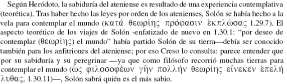 La phrónesis juega un papel fundamental en el tratamiento de la felicidad que hace Heródoto en su historia de Creso: sobre todo en su elaboración del sabio teorético Solón y el modo que éste tiene de reflexionar y hacer reflexionar a Creso sobre la phrónesis de la vida corriente, de cualquier vida en la comunidad (no sólo la vida del sabio, como es evidente por los ejemplos que proporciona Solón del hombre olbiótaton). La phrónesis también juega un papel fundamental en la narración atlántica y en el modo en que ésta se inserta en el programa más amplio de los dos diálogos, Timeo- Critias, considerados como un conjunto. La cuidada elaboración del personaje del sabio Solón, asimismo, contribuye tanto a la unidad narrativa de las Historias como a la legitimidad política, "histórica" y poética del relato acerca de la Atlántida. Algunos han querido ver incluso en el vínculo que teje Heródoto entre Creso y Solón el mismo tipo de crítica política que otros han visto proyectada en la Atlántida: G. Nagy opina, por ejemplo, que a través del intercambio entre Creso y Ciro junto a la pira encendida –cuando Ciro recapacita, por la evocación que hace Creso de Solón, en que le convendría respetar la dignidad de Creso– Heródoto se está pronunciando sobre el conflicto entre Atenas y los demás miembros de la hélade en la guerra del Peloponeso. O sea sobre la forma en que Atenas debería actuar, cediendo en su soberbia y respetando la dignidad de los demás37 .