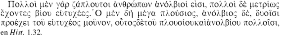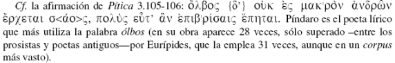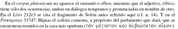 21 Una primera constatación léxica: el sustantivo aparece sólo dos veces en las Historias, en los pasajes que estamos aquí considerando: 1.32 (Solón dice a Creso: "a muchos a quienes dios había hecho entrever la felicidad (ólbos) los destruyó de raíz") y 1.86 (Creso, ya en la pira, piensa que la sentencia de Solón –ninguno de los mortales es feliz (ólbos)—era un aviso del cielo).En el corpus platonicum, la palabra no aparece ni una vez sustantivada y dos veces como adjetivo.