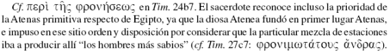 42 "Ay, Solón, Solón –dice, con condescendencia, el sacerdote egipcio al estadista ateniense— ¡los griegos serán siempre niños! ¡No existe el griego viejo! ... tienen almas de jóvenes, sin creencias antiguas transmitidas por una larga tradición y carecen de conocimientos encanecidos por el tiempo" (Tim. 22b-c), mientras que "lo que aquí [en Egipto] se conserva es lo más antiguo" (22e).