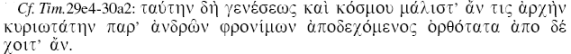 33 El contexto del pasaje 24b-c no habilita del todo una contraposición neta entre un uso de phrónesis entendida como sabiduría teórica y como sabiduría práctica. Lo que el sacerdote egipcio ha señalado –y Critias ahora recupera— es el lugar fundamental de la phrónesis en la formación de la comunidad política, lugar fundamental que se funda en el hecho de que ella, la phrónesis, permite ("tras descubrirlo todo acerca del universo, incluidas la adivinación y la medicina") trasladar el saber "de estos seres divinos al ámbito humano para su salud" y asimismo adquirir "el resto de los conocimientos relacionados con ellos". De modo que aquí –en el nivel del relato egipcio—la phrónesis es un ámbito de convergencia de saberes y no una oposición entre unos teoréticos y otros prácticos. El saber acerca de "todo en el universo, incluidas la adivinación y la medicina" no parece ser exactamente un saber "teorético", no al menos lo que modernamente se entiende por saber teorético. Ahora, en la propuesta específica que dará a su turno Timeo con su propio discurso –cuyo programa aparece resumido en las palabras del sacerdote egipcio pero que constituye, no obstante, una propuesta griega, no egipcia—, allí encontramos que el principio último en el que descansa el saber fundamental sobre el universo tampoco es estrictamente "teorético", ya que en la respuesta a la pregunta filosófica fundamental de por qué se hizo el mundo ("porque el hacedor es bueno y no anida ninguna maldad, contesta Timeo en 29e), vemos que "este principio importantísimo del devenir y del mundo" llega a nosotros por herencia del saber de otros hombres sabios. No llega por un particular uso del saber teorético sino por la aceptación de esa herencia (cf. Tim. 29e4-30a1: "Haríamos muy bien (apodéchoito) en aceptar (apodechómenos) de hombres sabios este principio importantísimo del devenir y del mundo"). Allí tampoco nos encontramos, al parecer, con un tipo de saber estrictamente "teorético". El tema, que se vincula también con el singular eikós lógos definido en Tim. 29b-d, merece un tratamiento más amplio, en el que no podemos extendernos aquí.