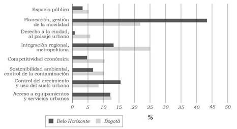 En relación con las políticas urbanas (figura 2), en Belo Horizonte fue más relevante la relación entre movilidad y transporte urbano con las políticas de control del crecimiento y ordenamiento del uso del suelo (27%), seguido por la integración regional y metropolitana (24%) y el acceso a los equipamientos (22%). En Bogotá fue más importante la integración regional y metropolitana (32%) y el acceso a los equipamientos y servicios urbanos (13%). Es significativo el hecho de que los aspectos ambientales ocupen posiciones menos notables en las dos ciudades en la definición de los objetivos de política, al igual que el espacio público y el derecho a la ciudad y el paisaje urbano. Especialmente con respecto al espacio público encontramos en otro trabajo (Ardila y Parente, 2017) que en Bogotá hay una fuerte articulación entre movilidad y espacio público; sin embargo, esta integración es más valorada para los aspectos asociados a la regulación de la infraestructura y menos para los aspectos prospectivos. Los valores ambientales y estéticos continúan en un segundo plano, pese a que cada vez más se levantan voces en torno a estos temas esenciales para la calidad de vida.