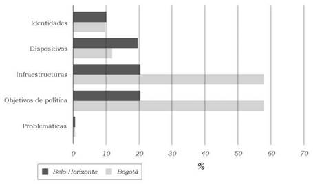 En cuanto a los dispositivos, la mayor participación en las dos ciudades es la de vehículos, 68% en Bogotá y 57% en Belo Horizonte, lo cual contrasta, especialmente en Bogotá, con el énfasis en las infraestructuras peatonales. Las bicicletas como dispositivos, de otra parte, tienen una participación mucho más significativa que los ciclistas e incluso que las infraestructuras para bicicletas. En las dos ciudades, los niños no son entendidos como sujeto móvil con demandas y experiencias específicas y se pueden considerar en general un agente invisible, sin embargo, este sujeto se distingue a través del dispositivo transporte escolar, lo cual limita la inclusión del sujeto móvil y sitúa el problema en los dispositivos. Un ejemplo es la recurrente referencia a modos no motorizados como peatón y bicicleta, en los que el sujeto “bici-usuario” y el dispositivo “bicicleta” se consideran equivalentes. Por ejemplo, el numeral 6 del artículo 163 del Decreto 364/2013, define el transporte no motorizado como “peatón, bicicleta y otros”.