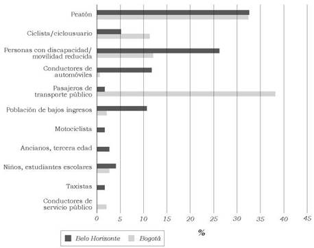 En las dos ciudades los peatones cuentan con una participación del 32%, la más alta para Belo Horizonte y la segunda para Bogotá, después de los pasajeros. Las personas con discapacidad constituyen el segundo grupo en participación en Belo Horizonte, con un 26%, y el tercero en Bogotá, con un 12%. Los agentes que en las dos ciudades tienen menor representatividad son los taxistas, motociclistas, niños, conductores de servicio público y adultos mayores. Sin embargo, cada ciudad presenta también énfasis diferentes. En el caso de Belo Horizonte, los conductores de transporte privado y la población de bajos ingresos tienen una participación mucho más significativa que en el caso de Bogotá, con un 12% y 10%, respectivamente; mientras que en la ciudad colombiana son los pasajeros de transporte público y los usuarios de bicicleta, con un 38% y 11%, respectivamente, los que cuentan con una participación mayor.