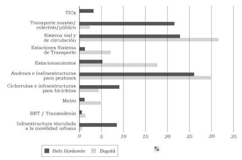 En relación con los aspectos sectoriales específicos del transporte y la movilidad observamos también diferencias significativas. A pesar del valor creciente concedido a este tema en las dos ciudades, es posible observar que mientras en Belo Horizonte se le atribuye un valor mayor a los objetivos que promueven los transportes no motorizados (24%), el mejoramiento de la accesibilidad a los sistemas de transporte (21%) y la priorización del transporte colectivo (22%), en Bogotá se priorizan la integración de los modos de movilidad y de las políticas urbanas a la movilidad (18%), el mejoramiento del transporte de carga (12%), la disminución y racionalización de los viajes en transporte motorizado (11%) y la promoción de políticas de sostenibilidad financiera y eficiencia de los proyectos de movilidad.