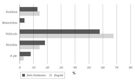 En relación con sus dinámicas de movilidad, las dos ciudades también presentan diferencias significativas. En Bogotá, según los datos de la encuesta de origen y destino de 2011, fueron realizados por año más de 17,6 millones de viajes, de los cuales la mayoría de ellos fue a pie (46%), en transporte colectivo (20%) y en Transmilenio/BRT (10%), mientras que los viajes en carro solo alcanzaron el 10% (CCB y UniAndes, 2015). En Belo Horizonte, durante 2012, cuando fue desarrollada esta encuesta (BHTrans, 2014), fueron llevados a cabo 6,3 millones de viajes, de los cuales la mayor parte se hizo en carro (36,5%) y a pie (34,8%). El transporte colectivo en bus alcanzó el 20,8% y en metro solo el 1,3%. La primacía de los viajes en carro en la capital del Estado de Minas resulta bastante evidente, mientras que en Bogotá son notables el uso del transporte público y los desplazamientos a pie.
