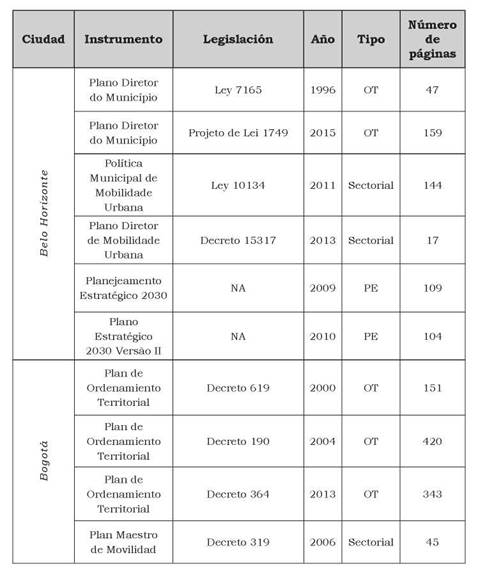 Para estudiar los acontecimientos, aspectos contextuales, agentes e intereses que han permitido el posicionamiento de estos debates en la esfera pública, nuestro trabajo realiza un análisis de contenido de instrumentos de política pública. Tanto en Bogotá como en Belo Horizonte se analizan integralmente los documentos correspondientes a los instrumentos de ordenamiento territorial y de carácter más sectorial como los planes de movilidad. Para Belo Horizonte, se incluyen además dos instrumentos de planeamiento estratégico. Bogotá, al igual que muchas otras ciudades en Latinoamérica, adoptó parte de los principios de planeamiento estratégico y en 1995 formuló el plan estratégico Bogotá 2000; sin embargo, este ejercicio no pasó de ser un insumo para la formulación del POT. Excepto los planes estratégicos de Belo Horizonte, los demás instrumentos son de carácter legalmente vinculante; la tabla 1, a continuación, resume la masa documental analizada.