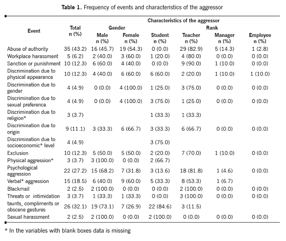 A total of 70.4% of the students reported having experienced at least one of the events investigated during their university stage. Table 1 presents the frequencies found for each event, as well as sex and rank of the aggressor. It can be seen that the most frequently reported events were abuse of authority (43.2%), taunts, compliments or gestures (32.1%), psychological aggression (27.2%), and verbal aggression (18.5%). In most of the events, the frequency of the female sex offender is higher; however, the male sex was predominant in sanction or punishment (60%), physical aggression (100%), blackmail (100%), taunts, compliments or obscene gestures (73.1%), and sexual harassment (100%). In most events, professors had the role of aggressors and, with higher frequencies than other ranks in abuse of authority (82.9%), workplace harassment (80%), sanction or punishment (90%), discrimination due to gender (75%), origin-based discrimination (66.7%), exclusion (70%), psychological aggression (81.8%), verbal aggression (53.3%), blackmail (10.00%), and threats or intimidation (100%). This study did not register any cases of rape.