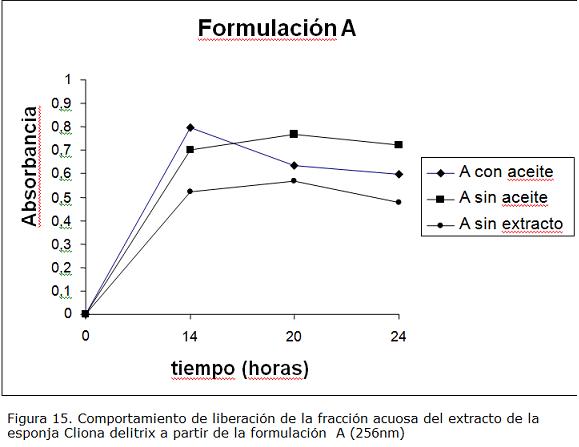 Con el estudio de liberación se encontró que las formulaciones liberan al medio, compuestos presentes en el extracto de la esponja que fue incorporado en los geles, donde posiblemente se encuentra la serotonina. Siendo este trabajo pionero en dicha temática y que permite contribuir a la solución de un problema de los arrecifes coralinos.
