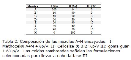 Se tomaron como punto de partida cuatro dispersiones de polímeros determinadas en la fase I: Methocel® A4M 4%p/v, Methocel® K100M 2.8%p/v, Cellosize® 3.2 %p/v, y goma guar 1.6%p/v, a partir de las cuales se realizaron mezclas de 3 componentes variando la proporción entre 0 y 100%, y manteniendo el cuarto componente (Methocel ® K100M 2.8%p/v) fijo en proporciones de 0%, 20% y 40% (ver Figura 3).