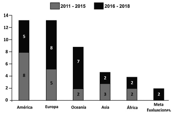 En función de su representación geográfica, la mayoría de los artículos seleccionados correspondió a estudios de caso realizados en América (13), principalmente en EUA, así como en Europa (13), que en conjunto representaron el 57 % del total, con lo cual se establecen como centros geográficos de publicación sobre valoración social en humedales costeros. El resto de los casos de estudio provino de Oceanía (20 %), Asia (11 %) y África (9 %), mientras que una proporción mínima (4 %) correspondió a dos meta-análisis, que se consideraron de manera independiente al resto de las regiones geográficas (Fig. 2).