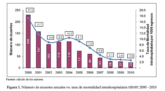 Results: The mean in-hospital mortality rate was 8.5 deaths for the period per thousand discharges (Min-Max = 2.6 -17.3). Of the 969 deaths 54.5 % was in men. Two out of three deaths were in children under one year and less than 1 % of deaths occurred in people over 15 years. Between 2000 and 2004 the leading cause of death in both genders was diarrheal disease (25 %) followed by pneumonia (17.2 %) and sepsis (12.3 %) and 71.3 % of the causes were associated infections. The 26.2 % of all deaths occurred between 2005 and 2010 and their causes are associated with chronic diseases. The hospital mortality rate was reduced 6.7 times and in 2010 there were 10 times fewer deaths than 2000.