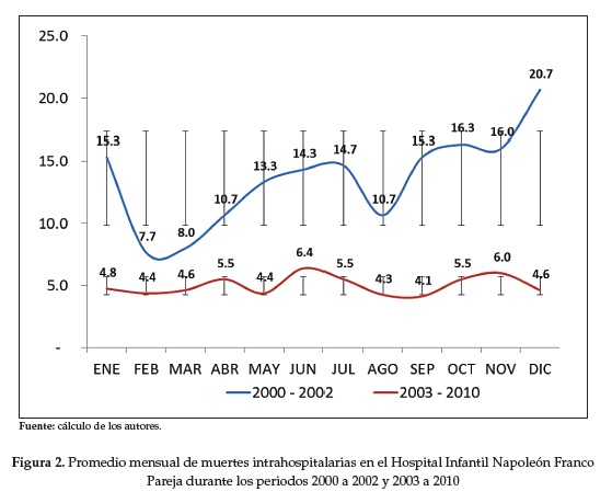 La figura 1 muestra la tendencia de la tasa cruda de mortalidad intrahospitalaria en el Hospital Infantil Napoleón Franco Pareja entre el 2000 y 2010. Como se observa, pueden caracterizarse dos periodos en esta década: un periodo de alta mortalidad hospitalaria (tasa bruta de 12.8 muertes por mil egresos) durante el 2000 y 2002 y un periodo de baja mortalidad entre 2003 y 2010 (tasa bruta de 6.3 muertes por mil egresos), con diferencias significativas (p<0.05). En la figura 2 se muestra las diferencias en la dinámica del número de muertes promedio mensual en los dos periodos. Mientras que durante el periodo 2000 a 2002 se registró un comportamiento estacional, en el periodo 2003 a 2010 la mortalidad fue menos oscilante.