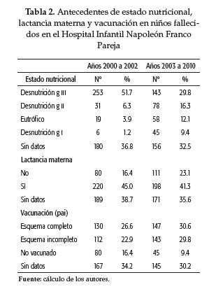 Durante el periodo 2000-2002 la mayoría de las muertes en el HINFP se produjo en niños con condiciones de riesgos evitables (falta de lactancia materna, sin vacunas o con esquema incompleto y con algún grado de desnutrición) (ver tabla 2).
