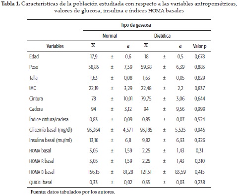 Materiales y métodos: Se realizó un estudio experimental aleatorizado con una muestra de 16 estudiantes de sexo femenino de tercer semestre del programa de Medicina de la Universidad del Norte. Su participación fue voluntaria, previa firma del consentimiento informado. Se determinaron las variables antropométricas: peso, talla e índice cintura/ cadera. Se extrajo muestras para la determinación de la glucosa e insulina en ayunas. Posteriormente se distribuyeron aleatoriamente en dos grupos. Al grupo control se le suministró una gaseosa normal de 600cc y al grupo experimental, una gaseosa dietética de igual volumen. Al término de 2 horas se extrajeron nuevas muestras para determinar niveles de glucosa e insulina postprandiales. Se recolectaron los datos y se realizó el análisis estadístico utilizando el software IBM SPSS v22.0.