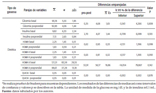 Los niveles de insulina posprandial (X Insulina basal = 13,16 ± 6,80 vs. X Insulina Post = 24,07 ± 14,86; p = 0,028), índice HOMA (X HOMA basal =3,05 ± 1,59 vs. X HOMA post =5,58 ± 3,49; p = 0,031), índice HOMA R (X HOMA R basal = 3,05 ± 1,59 vs. X HOMA R post = 5,51 ± 3,76; p = 0,048), e índice HOMA B (X HOMA B basal = 156,15 ± 81,28 vs. X HOMA-pos =316,52 ± 140,10; p =0,004) posprandial aumentaron significativamente posterior al consumo de gaseosa normal. No se determinó un aumento significativo en los niveles de glucosa posconsumo de gaseosa normal (A = 3,69 mg/dl; p =0,250).
