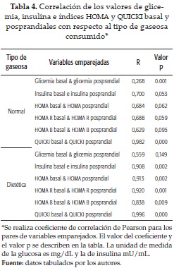 En el grupo que consumió la bebida dietética se encontró una relación lineal positiva estadísticamente significativa entre los niveles de insulina (r = 0,908; p = 0,002) y entre los índices HOMA ( r = 0,913; p = 0,002), HOMA R (r = 0,920; p = 0,001), HOMA beta (r = 0,838; p = 0,009) y QUICKI (r = 0,996; p = 0,001) pre y posprandial. No se evidenció correlación para estas variables en el grupo que consumió gaseosa normal, excepto para el índice QUICKI (r = 0,982; p = 0,001), lo cual es consistente con la naturaleza de este índice ver Tabla 4.