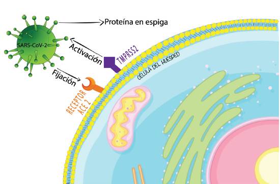 Figura 4 La proteína S del SARS-CoV-2 utiliza el receptor ACE-2 para su entrada en la célula del huésped y la proteasa celular TMPRSS2 para su activación