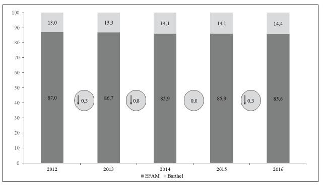 Se observó una disminución de la funcionalidad de las personas mayores de 2012 a 2016 (87 al 85,6%; Δ= -1,4 %). Entre cada año, excepto entre 2014-2015, se presentó un descenso de la funcionalidad y en consecuencia un aumento de la dependencia (figura 1).