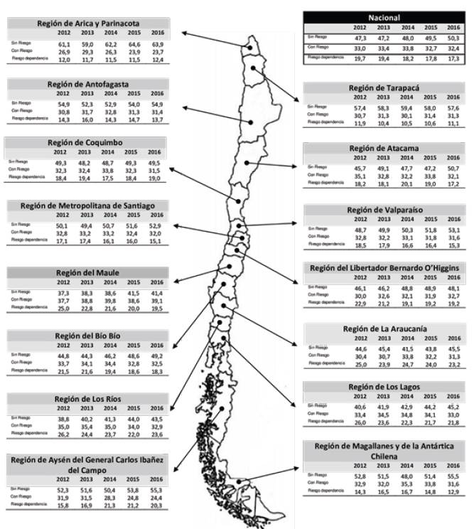 Al analizar a las personas mayores evaluadas con EFAM, según condición de funcionalidad y ubicación geográfica se observó que las tres regiones con mayor porcentaje de personas mayores autovalentes sin riesgo de dependencia fueron Arica y Parinacota (62,2 %), Tarapacá (58,1 %) y Aysén del General Carlos Ibáñez del Campo (52,7 %). Las regiones con mayor porcentaje de personas mayores autovalentes con riesgo de dependencia fueron Maule (38,8 %), los Ríos (34,5 %) y los Lagos (34,0 %). Por otro lado, las tres regiones con mayor porcentaje de personas mayores con riesgo de dependencia se encuentran en la zona sur del país, en Araucanía, Los Ríos y Los Lagos, con 24,2, 24,0 y 23,1 %, respectivamente (figura 2).