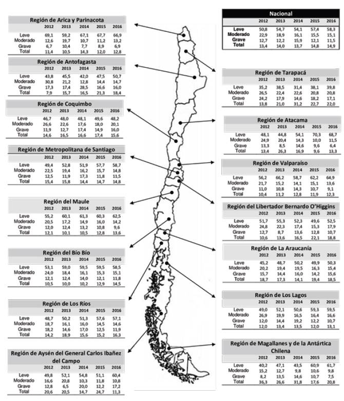 Población y muestra: Se tomaron datos de los años 2012-2016 obtenidos del REM-P5 Sección A, que corresponde a toda la población chilena en control por condición de funcionalidad en la salud pública. Los datos obtenidos son representativos de la población nacional en el periodo de años analizados y fueron de carácter nacional y regional.
