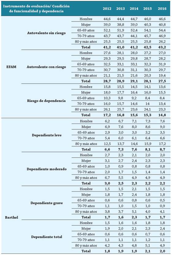 Cuando se analizó el nivel de funcionalidad de todas las personas mayores durante 2012 y 2016, se observó un aumento de la autovalencia sin riesgo (41,2 a 43,2 %; Δ = 2 %) y un descenso de la autovalencia con riesgo (28,7 a 27,5 %; Δ =-1,2 %) y el riesgo de dependencia (17,2 a 14,8 %; Δ =-2,4 %). Cuando se analizan los niveles de dependencia, se observa que las personas mayores dependientes leve y total aumentaron (6,6 a 8,7 %; Δ =2,1 % y 1,8 a 2,0 %; Δ =0,2 %, respectivamente), los dependientes moderados disminuyeron (3,0% a 2,2%; Δ =-0,8%) y los dependientes graves se mantuvieron (1,7 a 1,7 %; Δ =0 %). Estas tendencias de la funcionalidad y dependencia entre 2012-2016 se mantuvieron en hombres y mujeres y en los distintos rangos etarios (tabla 1).