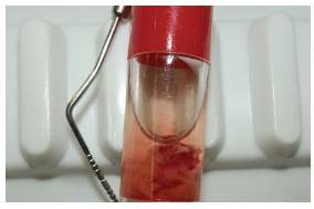 Figura 2A Extirpación quirúrgica de la lesión, se observa tejido firme, blando y sangrante de 9x4 mm