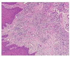La muestra extirpada se almacenó en formol tamponado al 10 % para su análisis histopatológico (figura 4A). Esta arrojó el siguiente resultado: los cortes mostraron mucosa oral con hiperplasia marcada del epitelio. A nivel de la lámina propia se observó infiltrado inflamatorio de predominio linfoplasmocitario de distribución heterogénea, proliferación fibrocolágena y de vasos de pequeño calibre (figura 4B) El diagnóstico definitivo es granuloma telangiectásico.